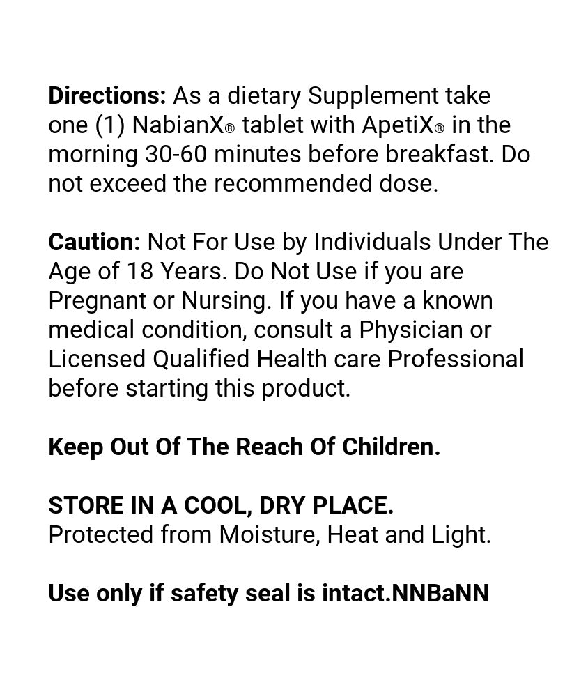 As a dietary supplement take one (1) NabianX® tablet together with ApetiX® in the morning 30-60 minutes before a well-l balanced and nutritious breakfast. Do NOT exceed the recommended dose.